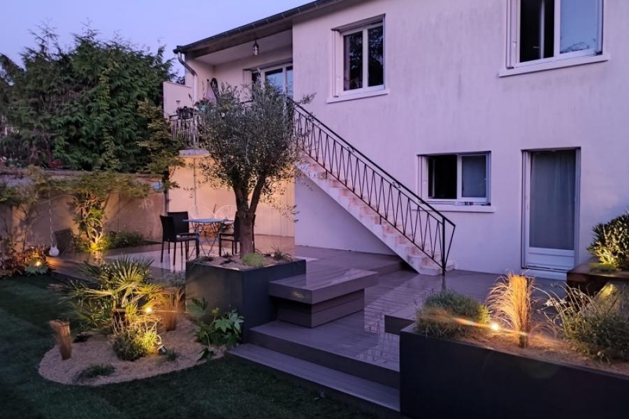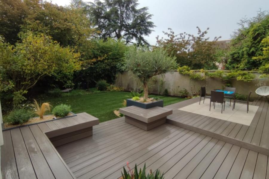 Nous avons donc exécuté leurs souhaits en réalisant l'aménagement. La terrasse en béton laisse place à un revêtement en composite et d'un insert en dalle de grès cérame. Des bacs en aluminiums s'encastrent dans l'espace ainsi que des banquettes en composite et des jardinières sur mesure en traverses paysagères.