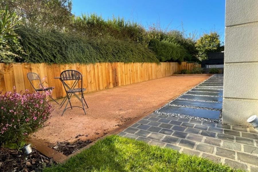 Sur le côté de la maison, nos équipes ont réalisé une retenue de terre en traverses paysagère et un terrain de pétanque.