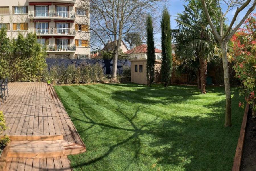 L'ensemble de la clôture grillagée a été enlevée et remplacé par des claustras en bois. Quelques mois plus tard c'est un gazon en plaquage qui est mis en place pour permettre à toute la famille de profiter pleinement du jardin dès les premiers rayons de soleil du printemps.