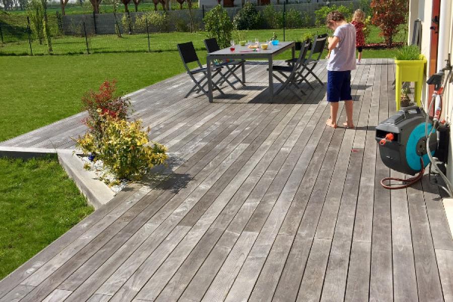 Afin d'apporter un espace plus chaleureux, c'est auprès d'une terrasse bois que la famille s'est tournée. Nous avons donc sélectionné ensemble le thermo-frêne pour la patine et le coloris gris argenté. Nous avons conçu cet espace pour toute la famille, pour qu'ils puissent se retrouver autour d'une table pour le déjeuner et laisser place à la créativité des enfants.