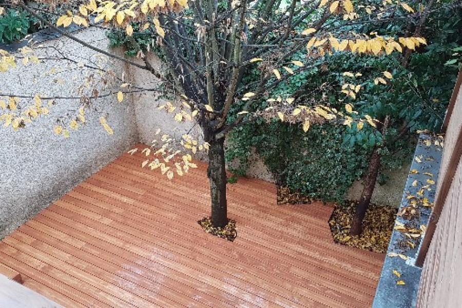 Pour l'existant, nous partons sur un revêtement en accoya (un bois extrêmement résistant, garanti 50 ans) entouré d'une palissade en Thermopin pour masquer le vis-à-vis et la façade du mur.