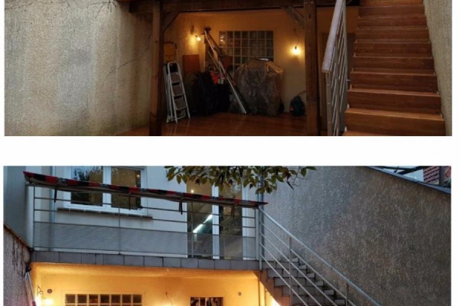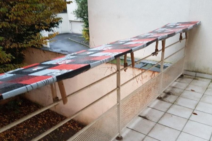 Une terrasse en balcon existante vétuste et un garde-corps plus à l'ordre du jour étaient présents. Ce balcon donnait sur une étendue d'herbe peu pratique à entretenir.