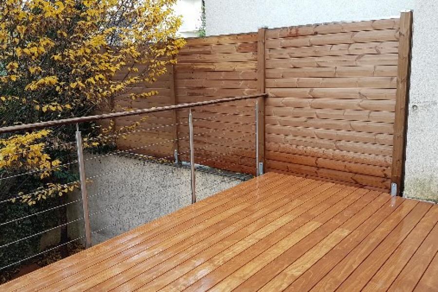 Pour sécuriser l'ensemble, nous avons posé des garde-corps Blagnac. Un garde-corps extérieur en bois et inox.