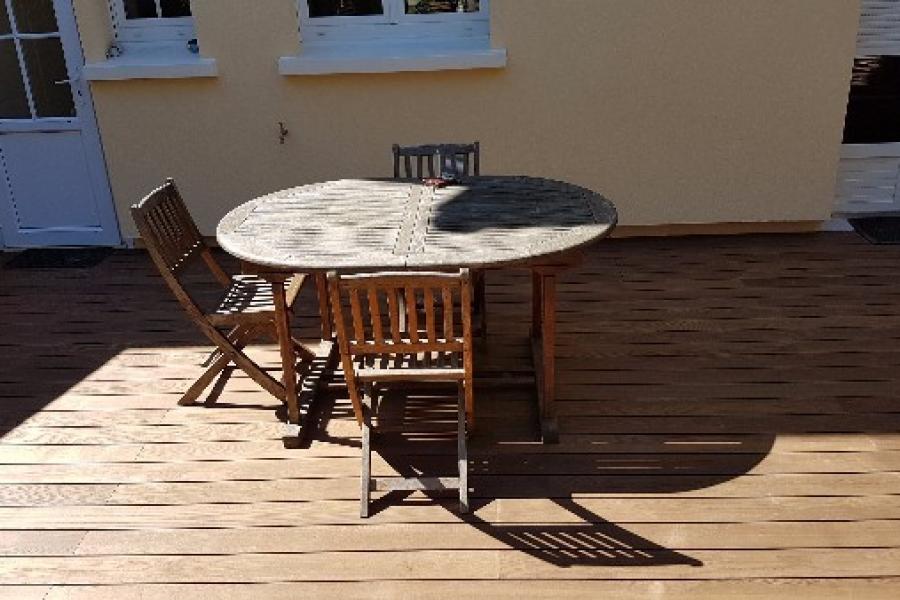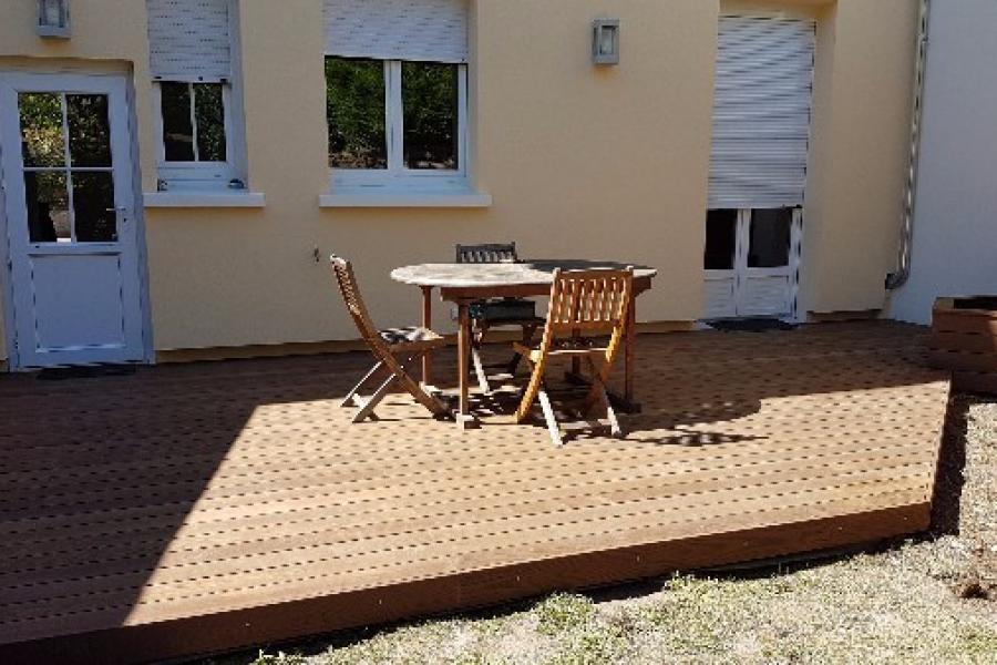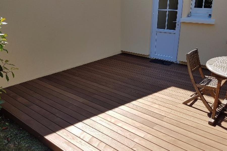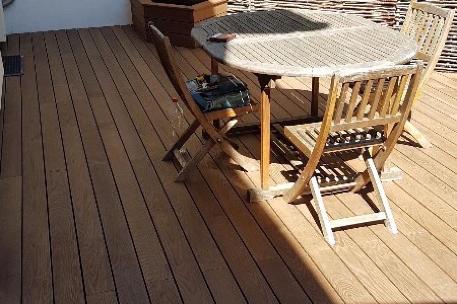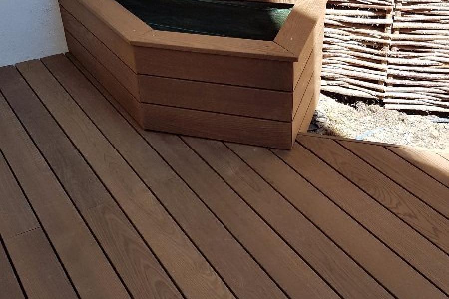 Ici, il s'agit d'une réalisation d'une terrasse bois Thermofrêne, avec conception d'une jardinière en bois, également en Thermofrêne.