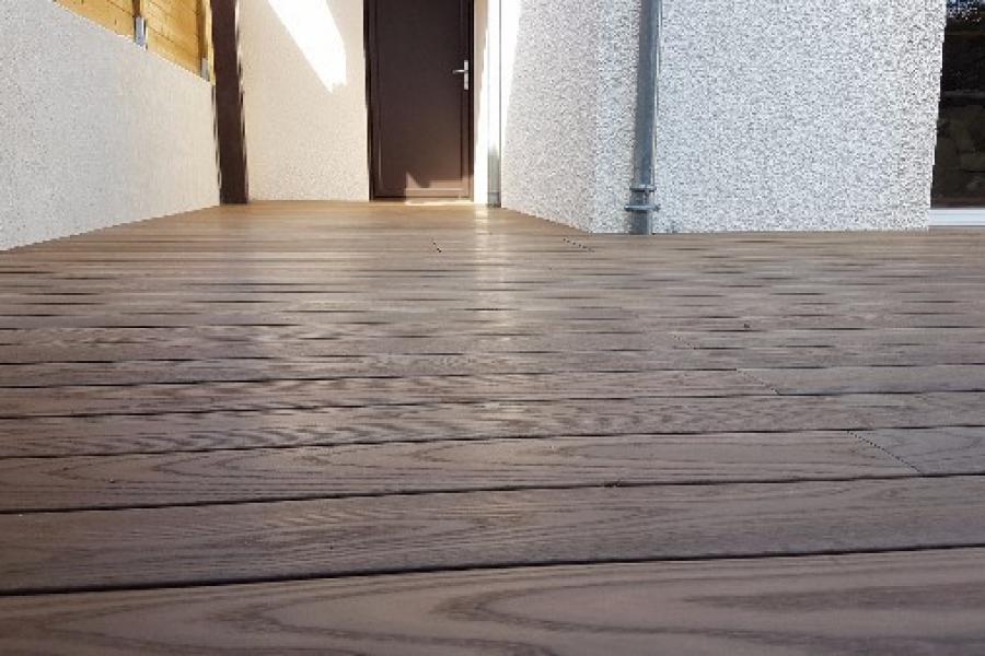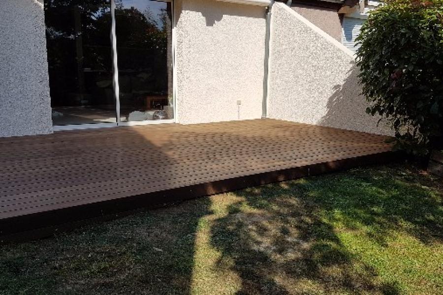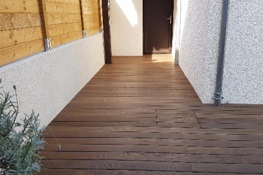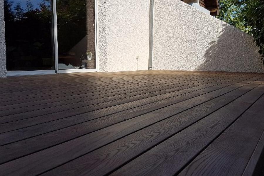 Après une première visite, nous avons tout de suite pensé aux thermo-frêne qui irait parfaitement avec l'environnement existant. Nos référents de la terrasse bois dans le 91 ont donc réalisé le revêtement en deux jours.