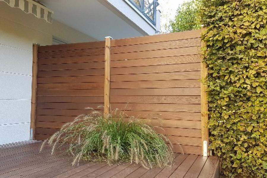 Aujourd'hui nous aimons particulièrement notre tranquillité et nous voulons profiter de nos extérieurs dès que le temps nous le permet. C'est pourquoi nous avons isolé du vis-à-vis nos clients grâce à des panneaux en bois dit claustra bois.