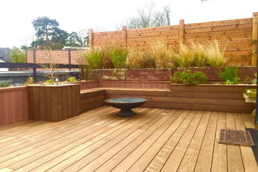 Après le passage de notre équipe, le toit-terrasse a une tout autre allure ! Platelage en thermo-frêne, réalisation de banquette et de bacs sur mesure agrémentés de végétation.